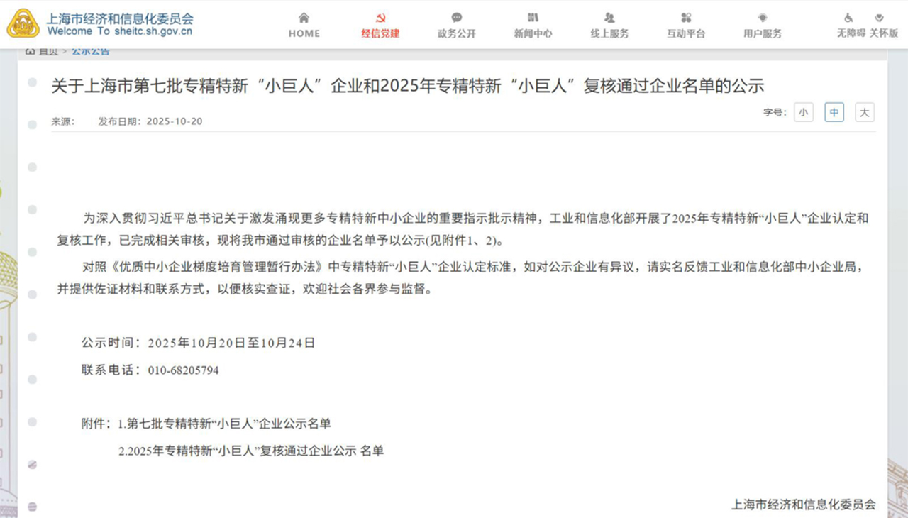 近日,上海市经济和信息化委员会发布了关于上海市第七批专精特新“小巨人”企业和2025年专精特新“小巨人”复核通过企业名单的公示。上海同臣智能装备有限公司(简称 “同臣装备”)凭借扎实的综合实力荣列其中,成功通过工信部2025年专精特新“小巨人”复核。