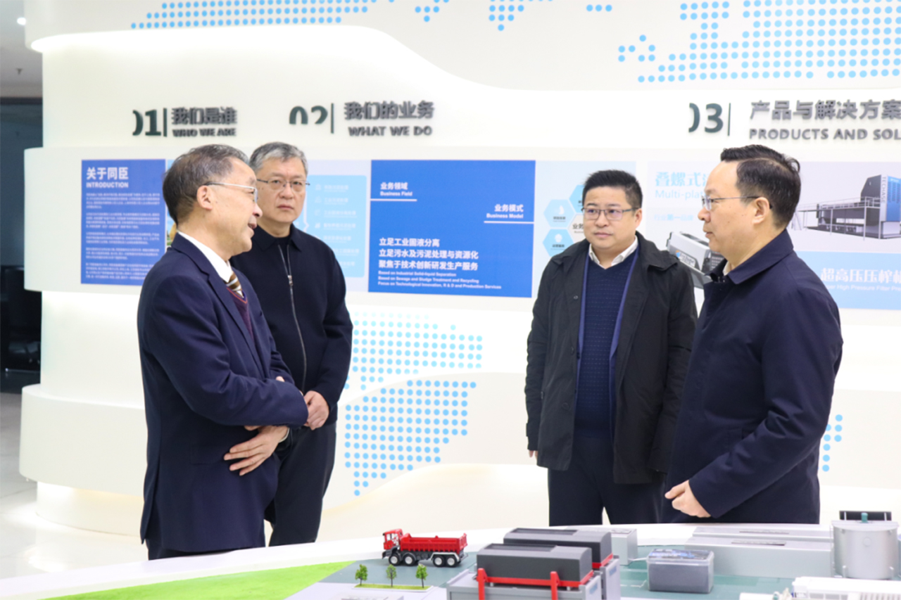 在总部的展厅里,张文标董事长对王朝杰副市长一行的到访表示热烈欢迎,并详细介绍了公司的创新产品及解决方案,以及在各行业领域的广泛应用。作为深耕资源化领域十七载的智能装备技术革新者,为响应国家“十五五“、”双碳”战略,公司重点推出的生物质碳源,能够以废治废,实现高浓度有机浆液的资源化利用和城市污水的协同处置,配合碳源发酵工艺AI智能体,云端智能精准调控。以及生产的TP型煤泥超高压压榨机在煤泥资源化领域的高效应用,实现与末煤掺配销售,助推煤泥行业提质增效。